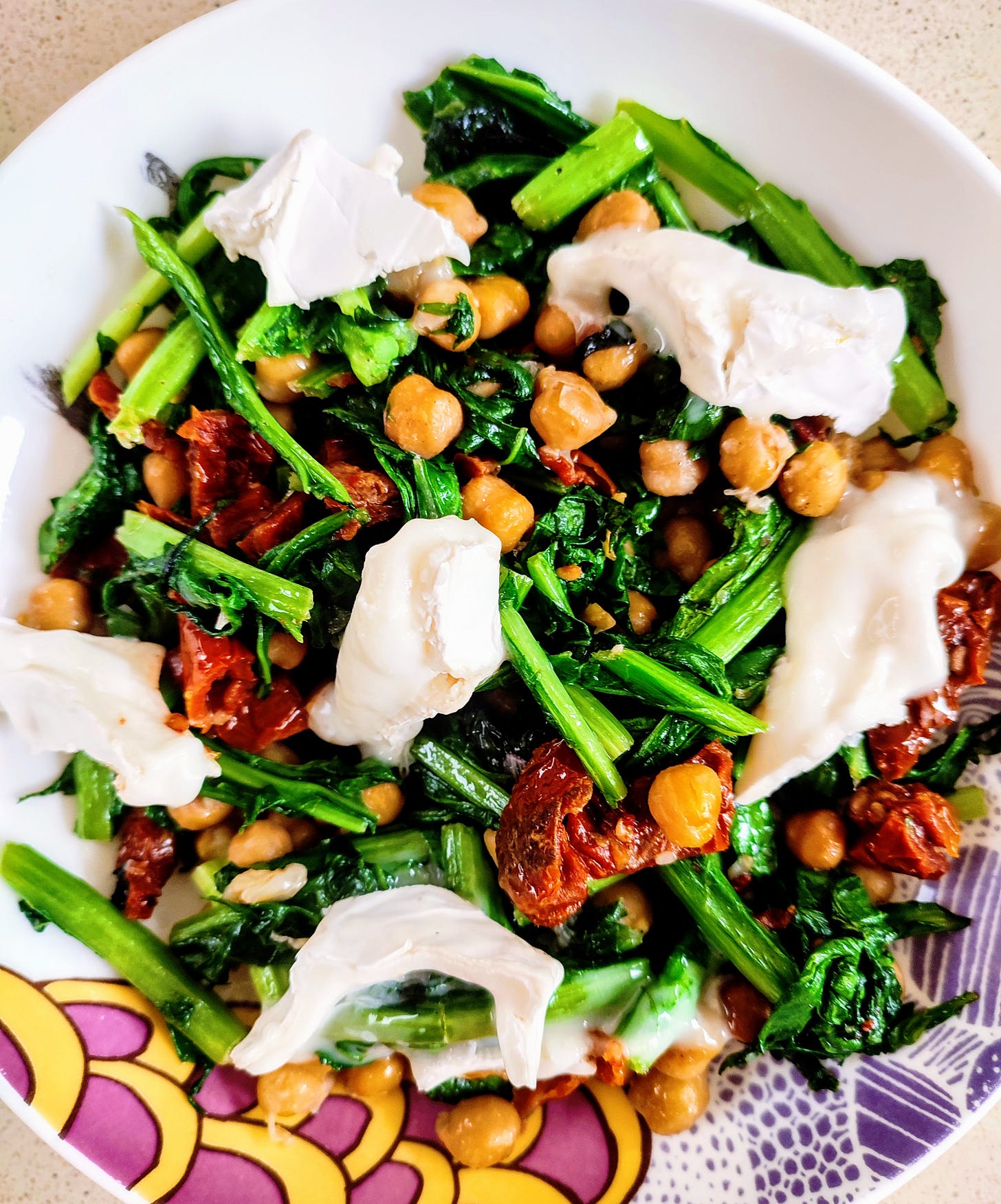 Quick tasty lunch - chickpeas fried up with garlic, mustard greens and sundried tomatoes, topped with goats’ cheese and this dressing which is one of my favourites.